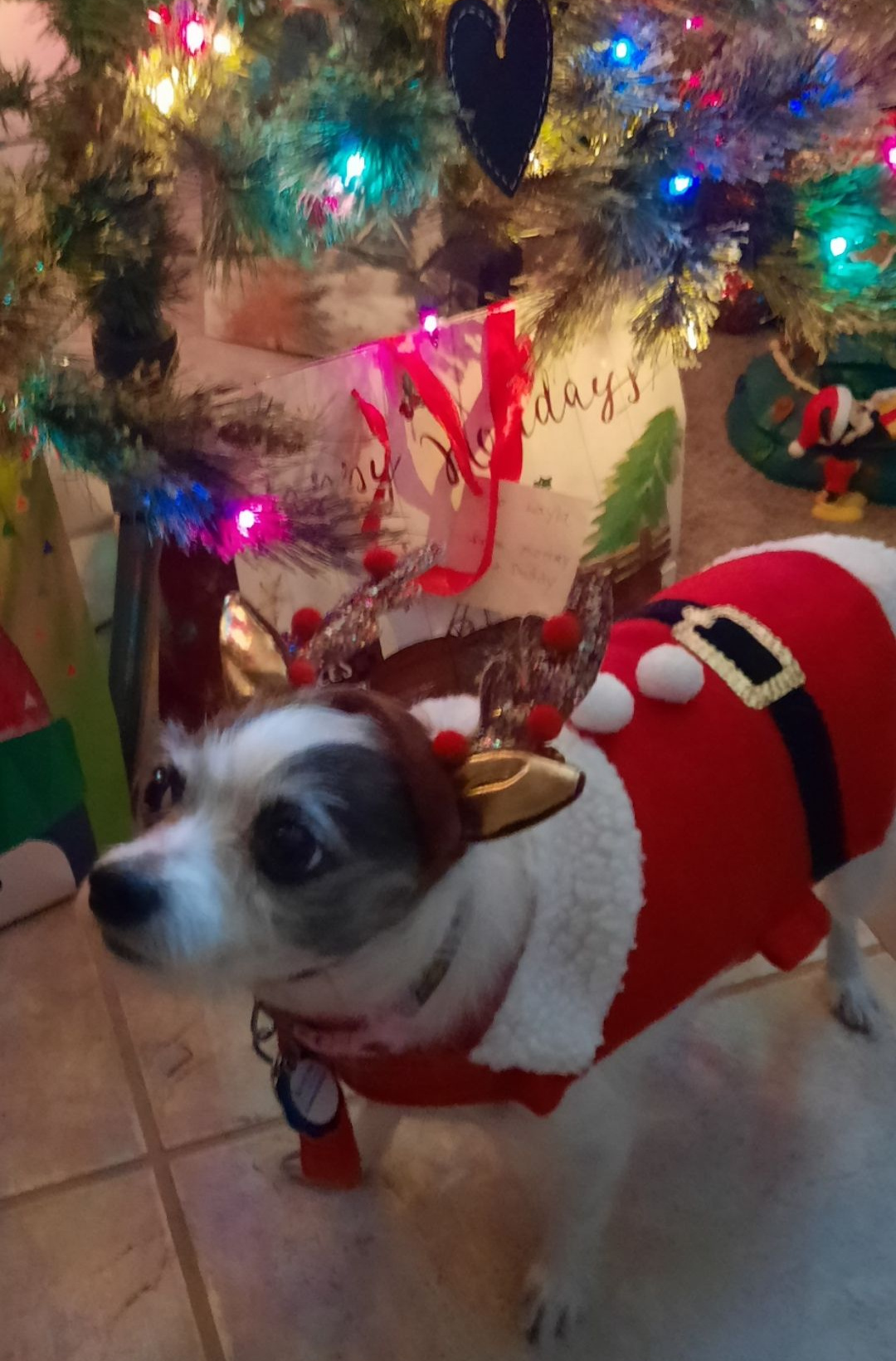 Chihuahua in Santa suit and reindeer esrd in front of Christmas tree.